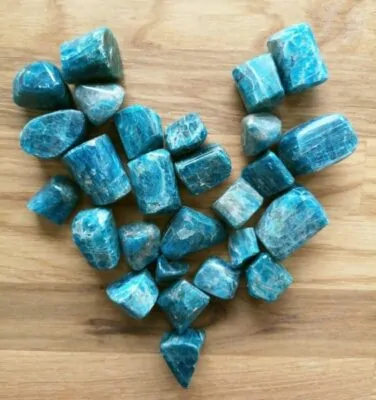 Blå apatit kan være lys eller mørk blå, nogle gange er det også i samme krystal at der er farveforskelle. Navnet Apatit kommer fra det græsk ord, der betyder “at bedrage”, fordi de forskellige farver og formationer, hvori denne sten forekommer, gør det let at fejl bedømme denne frem for andre mineraler. Apatit stenene her, er primært af høj kvalitet, og kan anvendes til metafysiske formål.