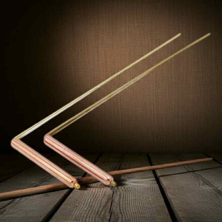 Søgerstave i messing med kobberhåndtag, er også kendt som dowsing rods og wünschelrute eller ønskekviste.